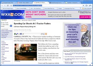 The folks at WXII continue to wow me with their headline writing prowess. In today's example they give a car on I-77 remarkable powers: Speeding Car Shoots at 3 Tractor-Trailers.